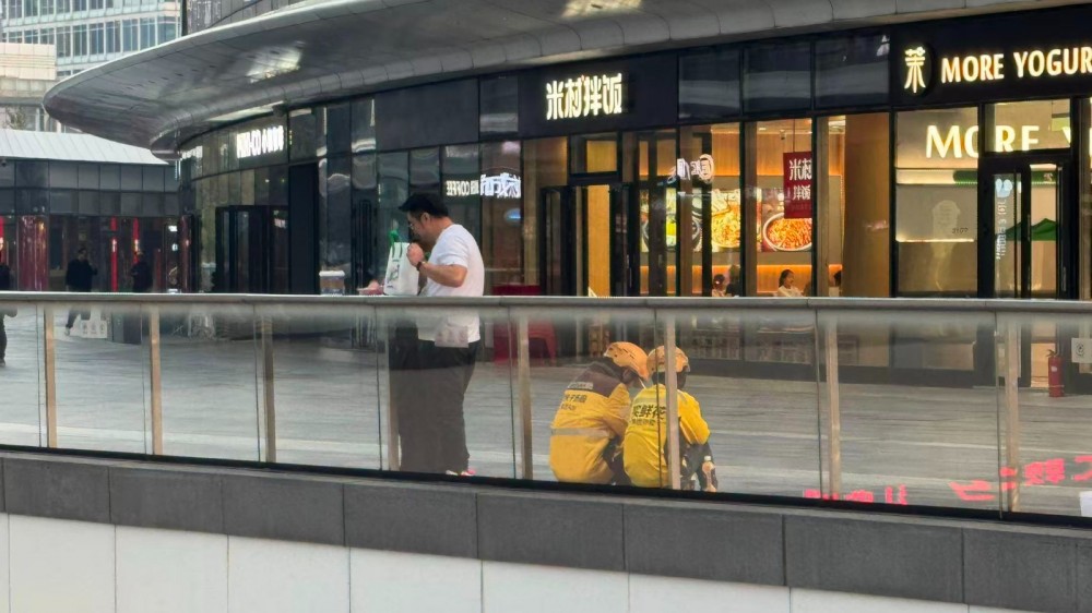 2025年10月15日,望京soho,席地休息的外卖员。