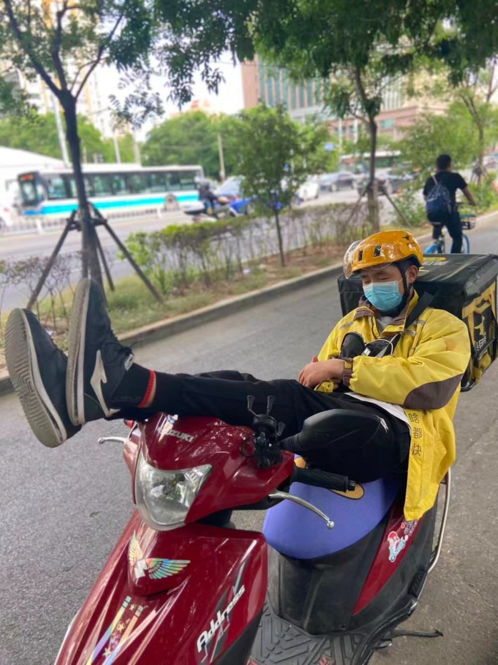 2021年5月16日,北京,街头休息的外卖员。