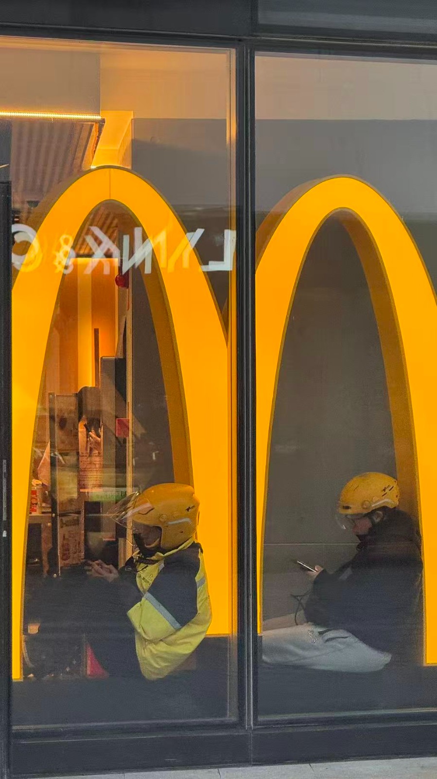 2025年11月19日,北京,晚高峰还没到,麦当劳里休息的两个外卖员。